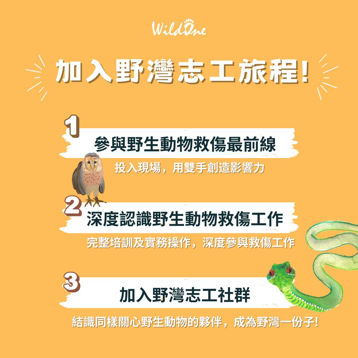 • 加入野灣志工社群:不僅結識第一線的保育工作者,更能與來自全台各地、同樣關心野生動物的夥伴們建立連結,成為野灣的一份子!