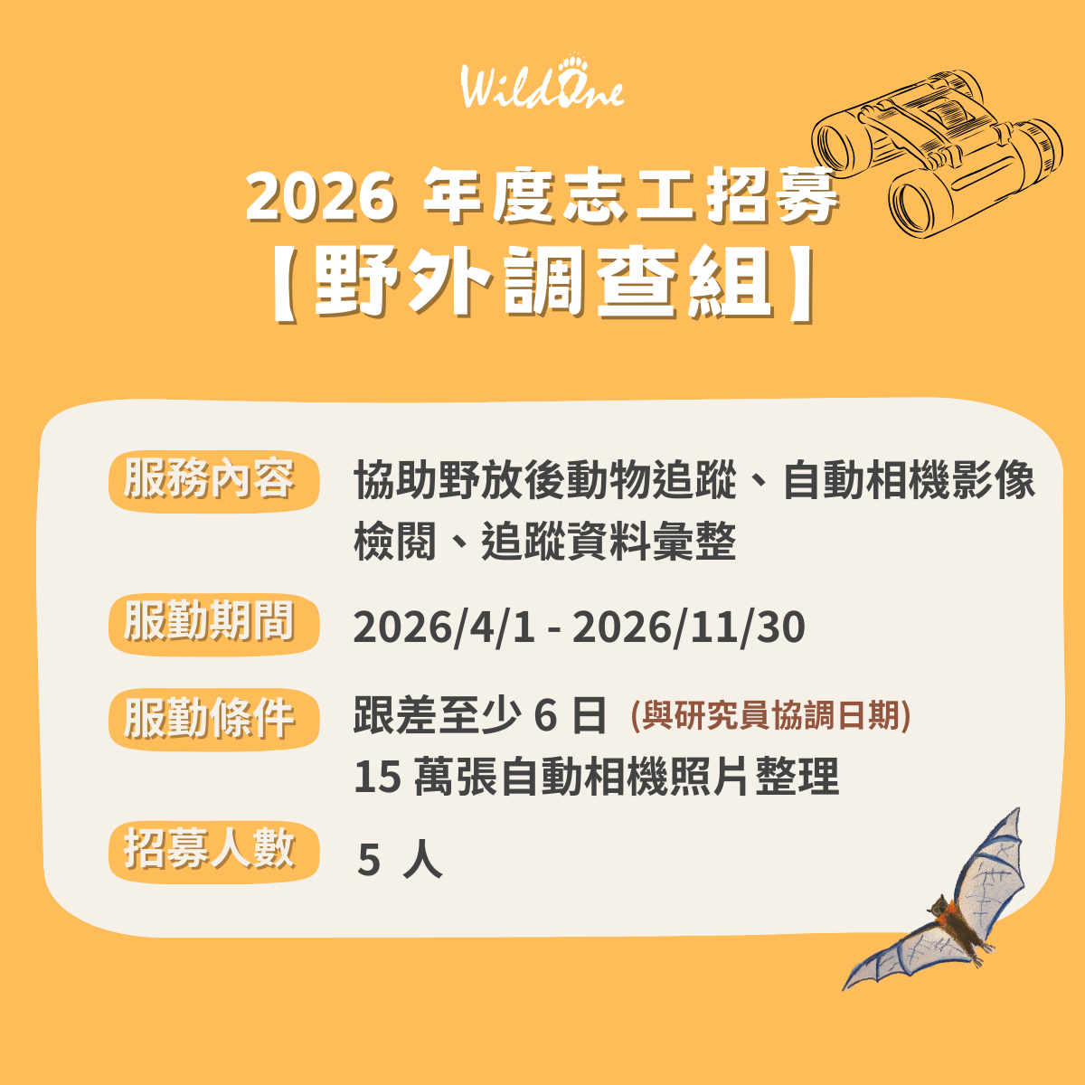 ◦ 適合對象: 具備基礎野生動物辨識能力,有戶外經驗、體力好,且能細心處理大量數據的你。