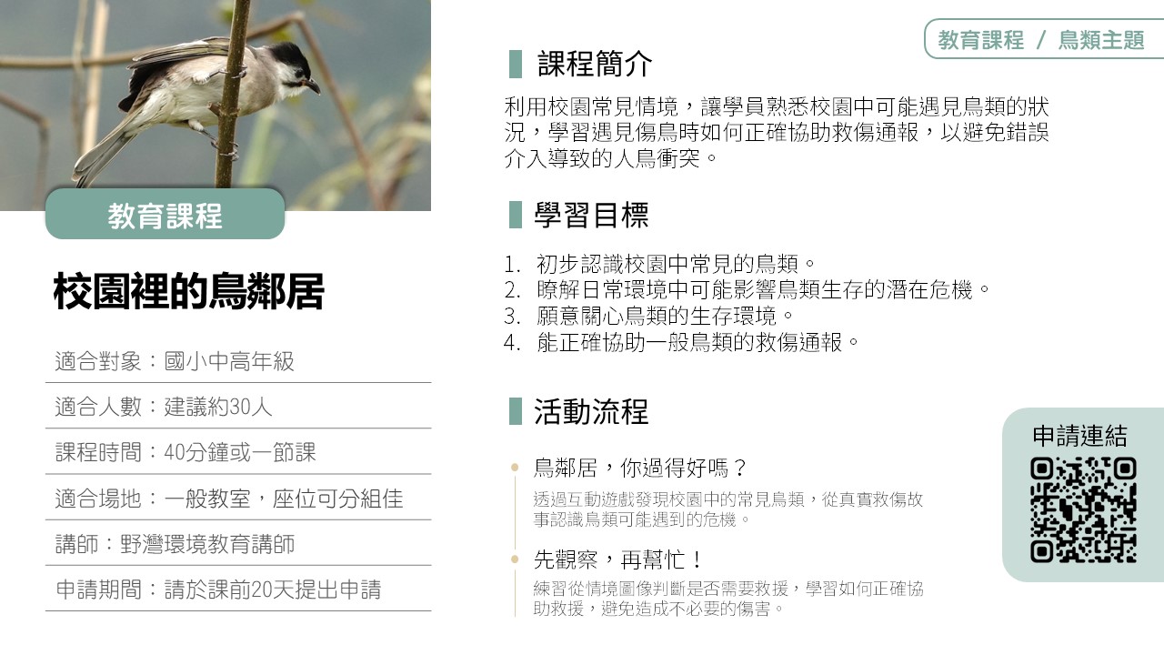 - 國小中高年級適用|《校園裡的鳥鄰居》課程申請連結