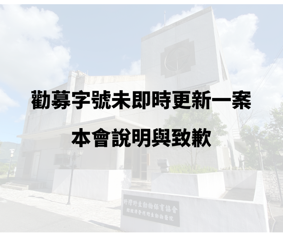 最後,再次為本次的行政疏失,向所有信任野灣的支持者與捐款人致歉。我們必定會記取教訓,以更嚴謹的腳步,繼續為野生動物努力。