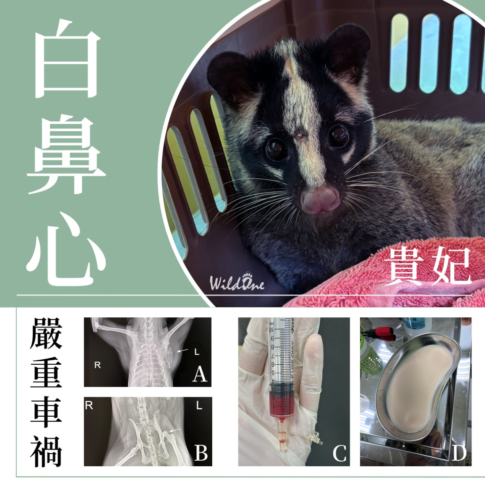 一直側躺的貴妃,是一隻由 野灣屏東分部 收到的成年雌性白鼻心,入院體重將近 4 公斤。車禍撞擊造成牠左側肩胛骨骨折、髖關節脫位,X 光檢查還發現胸腔積液。